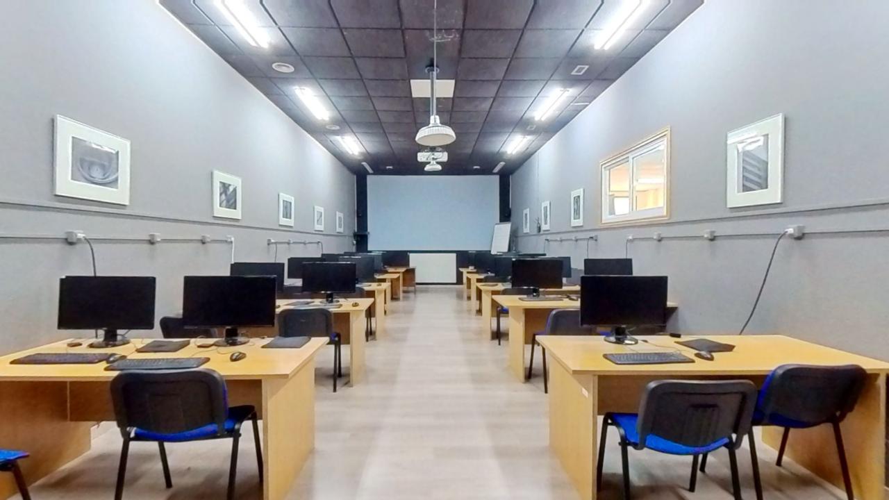 Amplia variedad de aulas polivalentes idóneas para formación, reuniones o preproducción, todas ellas con proyector, pizarra y con hasta 30 puestos de trabajo individual equipados con ordenadores y equipos multimedia.